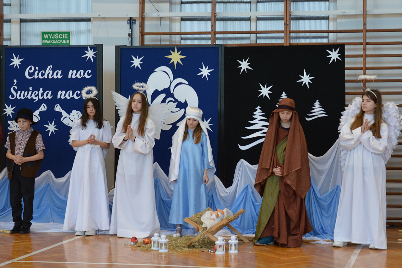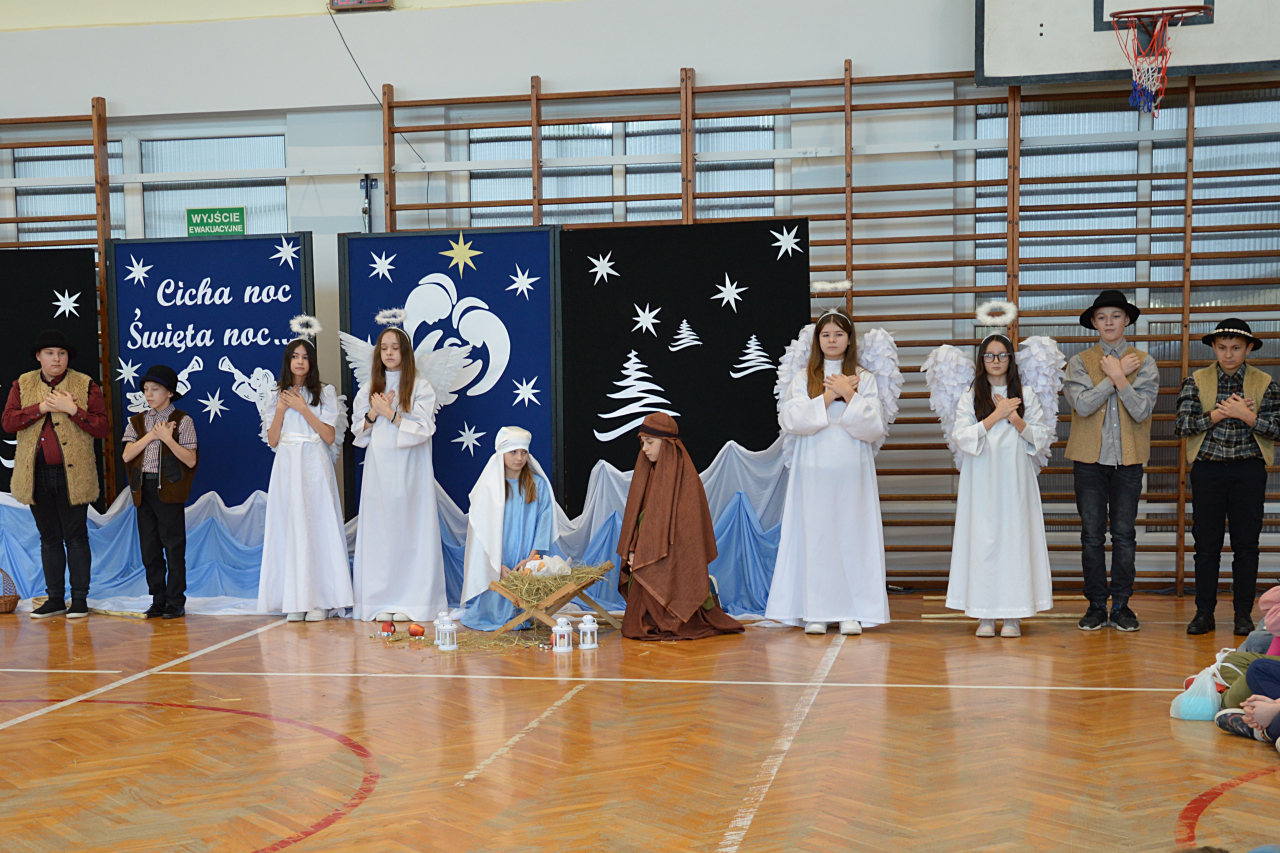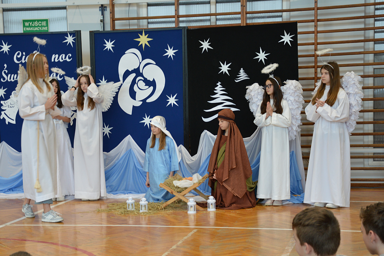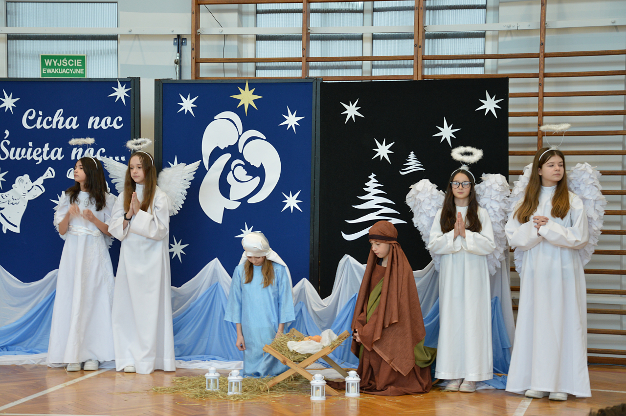 Czwartek 19 grudnia 2024 r. był dniem wyjątkowym w naszej szkole. Szczególnie wyczekiwaną chwilą, było spotkanie opłatkowe całej społeczności szkolnej. Uroczystość rozpoczęła się czytaniem Ewangelii, błogosławieństwem i poświęceniem opłatków przez księdza Roberta Firka. Tegoroczne spotkanie nawiązywało również do tradycyjnych Jasełek. Przedstawienie pantomimą, przygotowane przez p. Edytę Urban, w wykonaniu uczniów klasy VI A, dostarczyło oglądającym dużo wrażeń i wzruszeń. Przewodnicząca Samorządu Uczniowskiego złożyła wszystkim życzenia, po czym delegacje wręczyły Dyrekcji szkoły kartki i stroiki, wykonane przez samych uczniów. Następnie głos zabrał Pan Dyrektor – Józef Babiarz, przekazując wszystkim życzenia świąteczne w imieniu własnym i władz nadrzędnych.