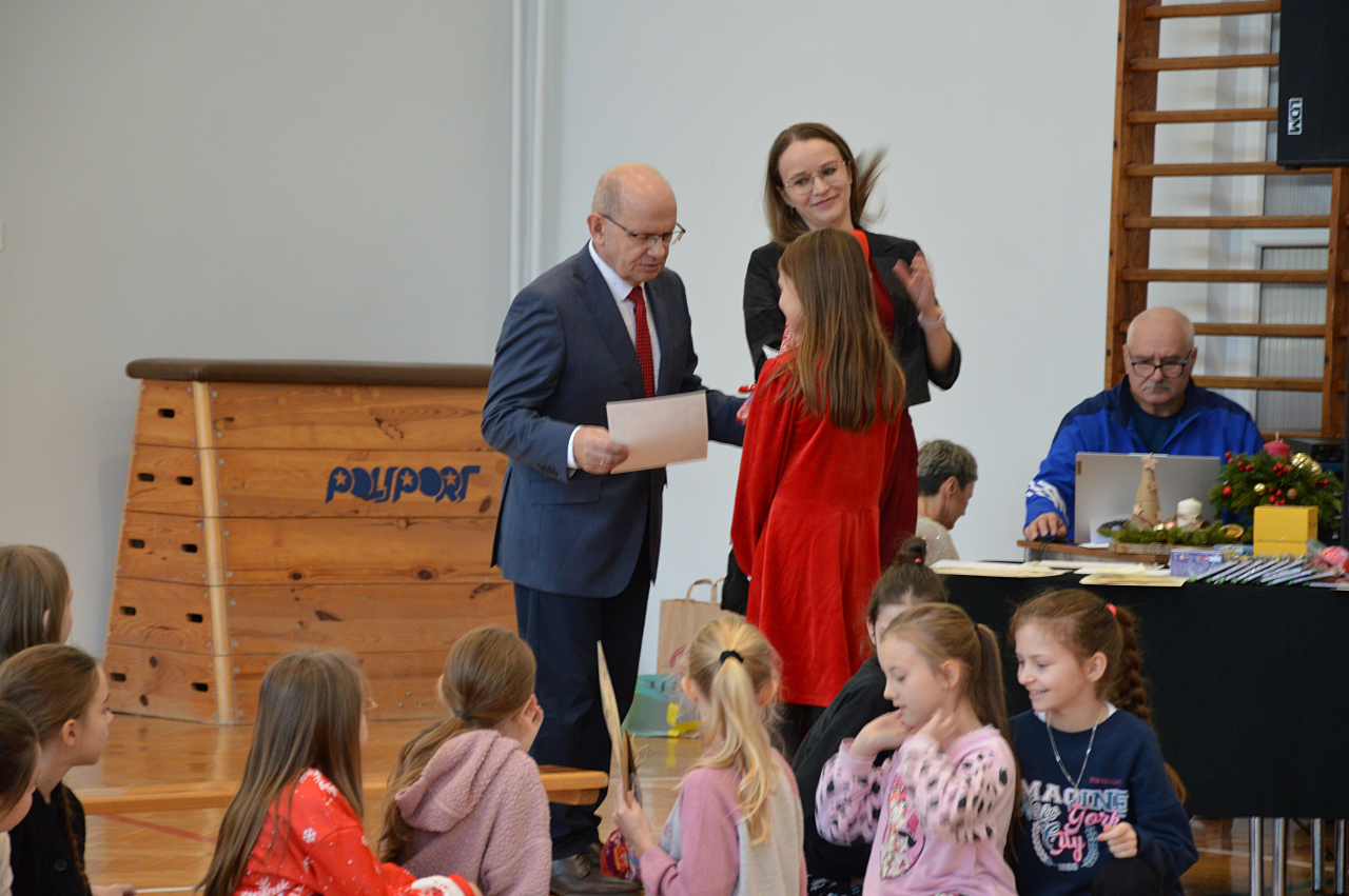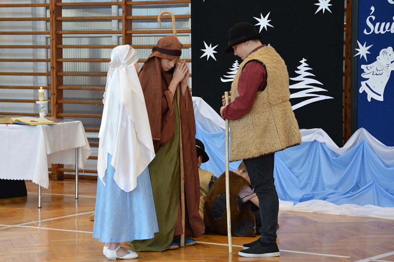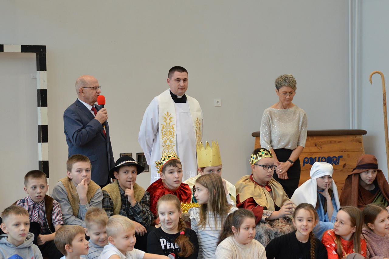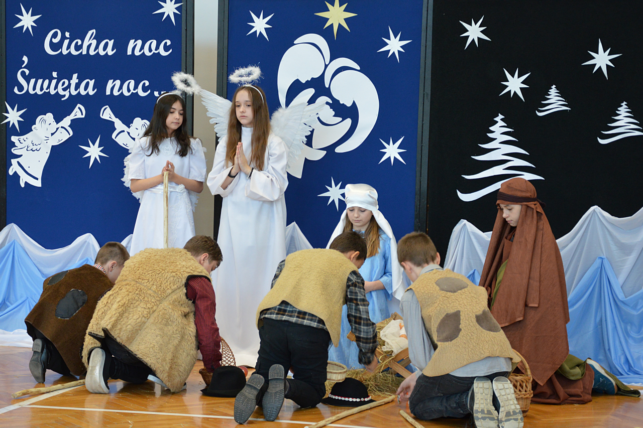 Czwartek 19 grudnia 2024 r. był dniem wyjątkowym w naszej szkole. Szczególnie wyczekiwaną chwilą, było spotkanie opłatkowe całej społeczności szkolnej. Uroczystość rozpoczęła się czytaniem Ewangelii, błogosławieństwem i poświęceniem opłatków przez księdza Roberta Firka. Tegoroczne spotkanie nawiązywało również do tradycyjnych Jasełek. Przedstawienie pantomimą, przygotowane przez p. Edytę Urban, w wykonaniu uczniów klasy VI A, dostarczyło oglądającym dużo wrażeń i wzruszeń. Przewodnicząca Samorządu Uczniowskiego złożyła wszystkim życzenia, po czym delegacje wręczyły Dyrekcji szkoły kartki i stroiki, wykonane przez samych uczniów. Następnie głos zabrał Pan Dyrektor – Józef Babiarz, przekazując wszystkim życzenia świąteczne w imieniu własnym i władz nadrzędnych.