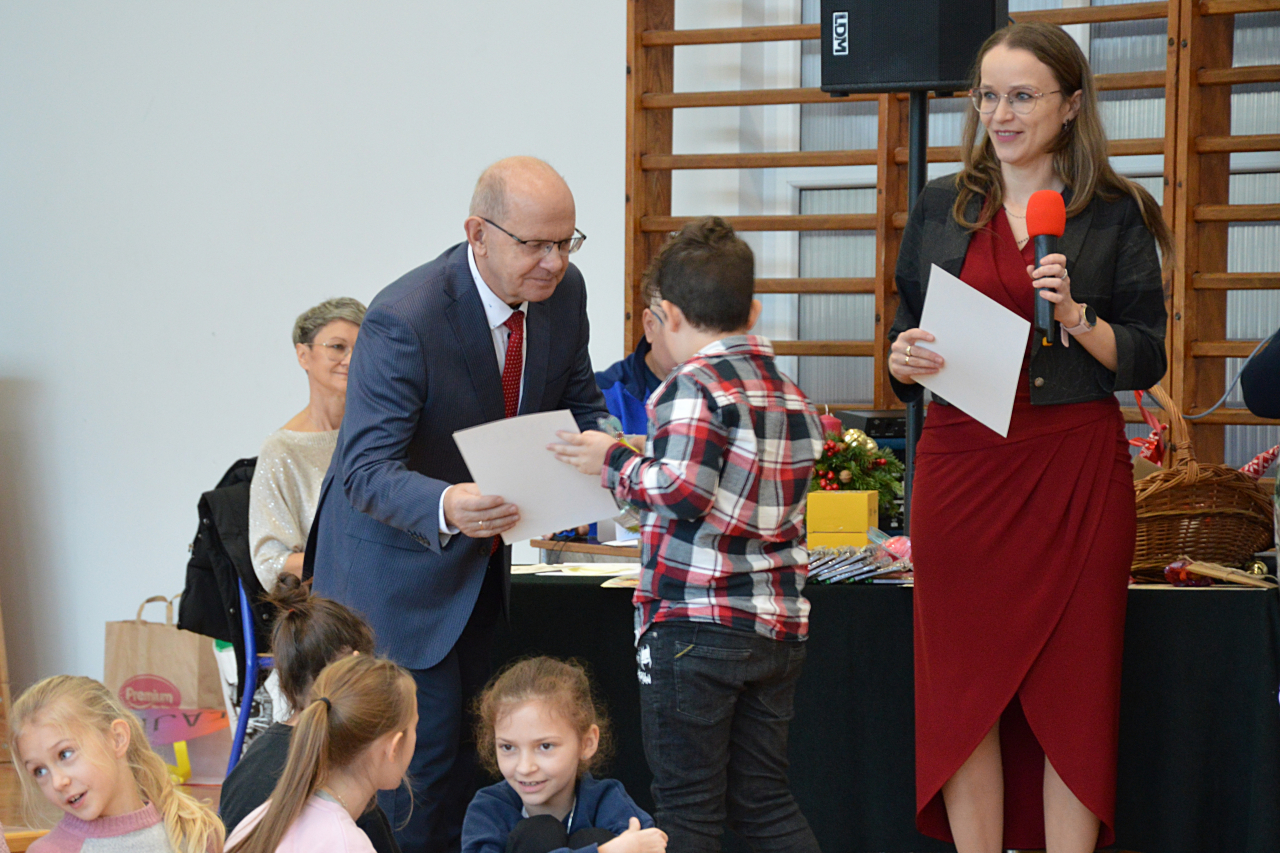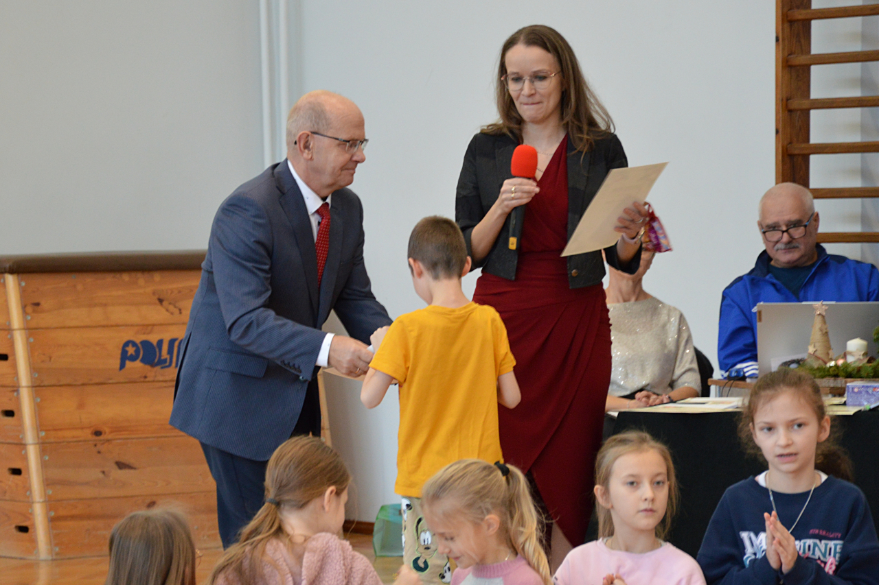 Na uroczystości zostali nagrodzeni i wyróżnieni uczniowie w konkursie na najpiękniejszą kartkę i stroik bożonarodzeniowy. Konkurs ogłosiła Rada Rodziców naszej szkoły, która ufundowała nagrody w czterech kategoriach: